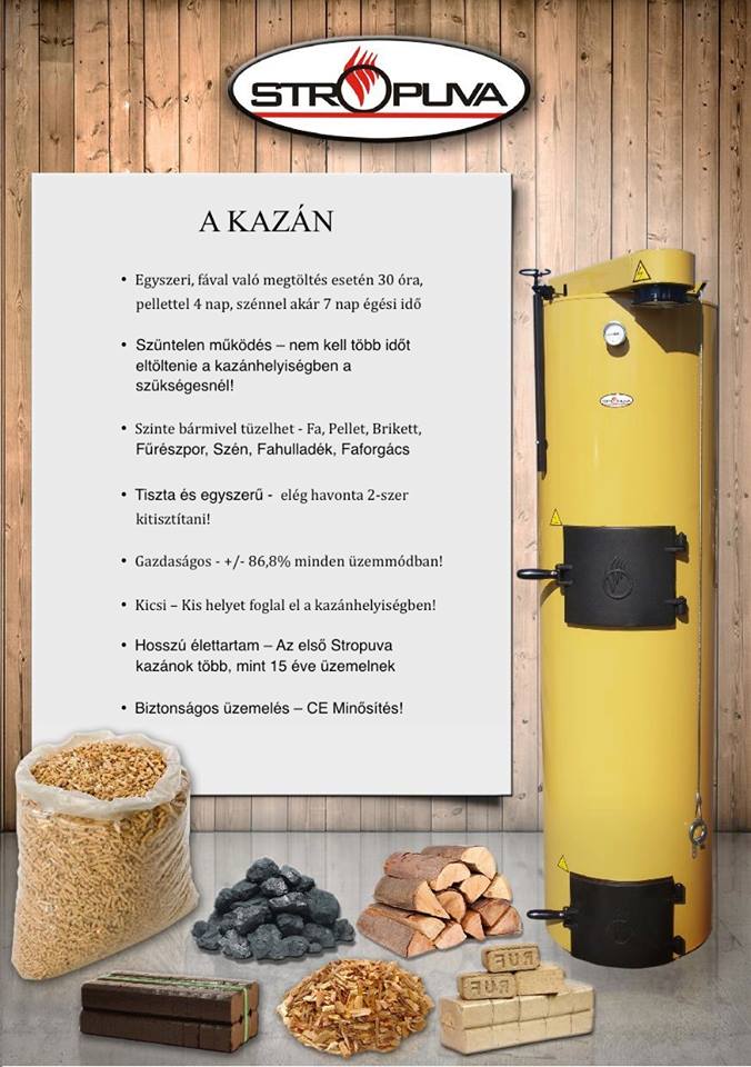 A Stropuva kazán egy szilárd tüzelésű kazán, amely a nagyon kevesek egyikeként megvalósíthatja az ember régóta dédelgetett álmát az autonóm fűtésről. Még lassan égő fa esetén is nagyon magas a hatásfok, így egy adag fa, a kívánt hőmérséklettől függően, több mint egy napig és egy éjszakán át ég. Szén használata esetén az égési idő akár 7 nap vagy több is lehet.